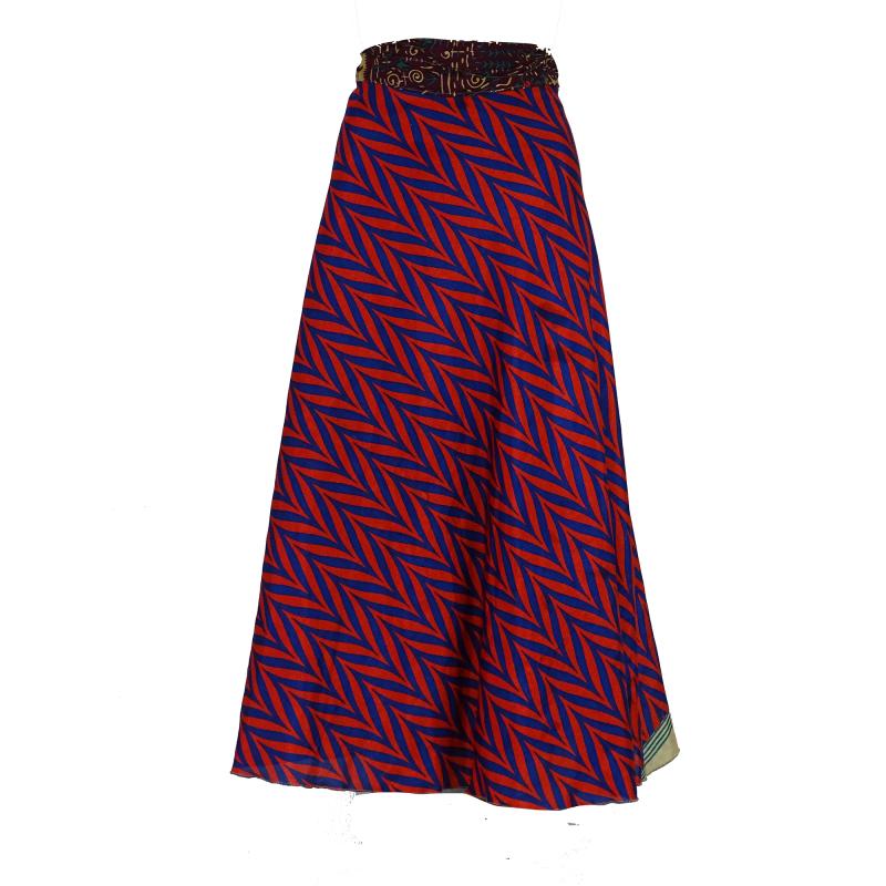 Slå-om nederdel fremstillet af genbrugt silkesari fra Indien. Sarien er et blandingsprodukt af silke og viscose/polyester. Kompositionen af den enkelte genbrugte sari kan variere Med bindebånd. Længde cirka 92 cm. Passer str. S-XLSilkesarierne bliver inds