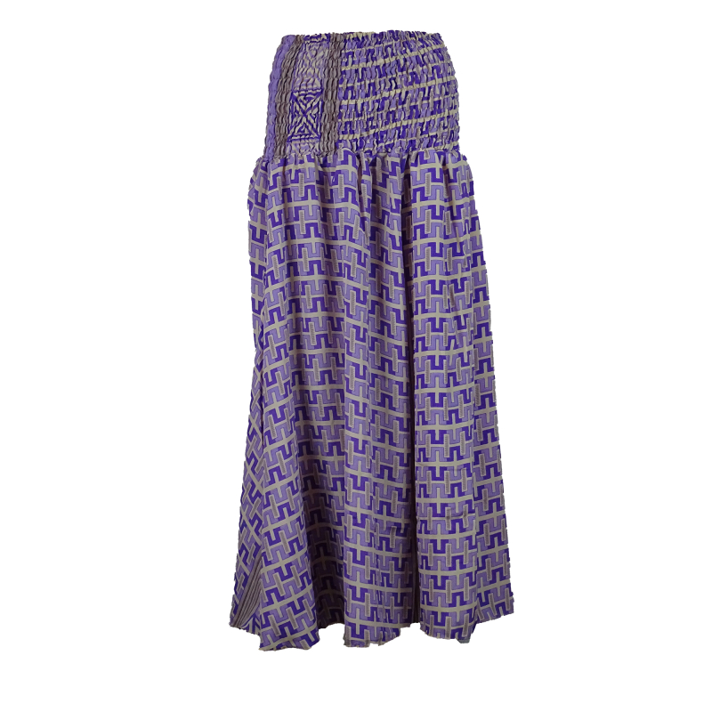 Buksenederdel fremstillet i genbrugt sari fra Indien. Palazzo bukser – eller en buksenederdel – er bukser med meget vidde i benene, så det samlede indtryk ligner en nederdel.